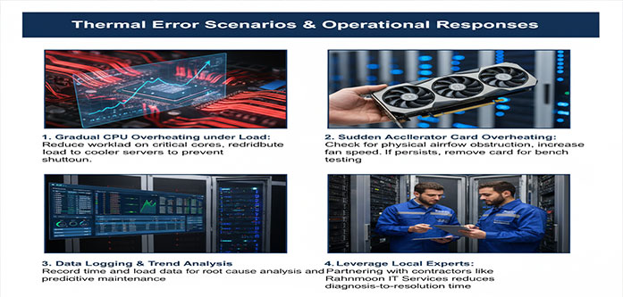 در سناریوی افزایش تدریجی دمای یک پردازنده در اوج بار، پاسخ عملیاتی میتواند کاهش بار کاری روی هستههای مهم و اجرای بازتوزیع بار به سرورهای کمتر داغ باشد تا از راهاندازی مکانیزم خاموشی جلوگیری شود. اگر یک کارت شتابدهنده دچار دمای ناگهانی شود، سریعترین اقدام بررسی امکان انسداد فیزیکی جریان هوا و افزایش دور فن مربوطه است؛ در صورت تداوم مشکل باید کارت را از سیستم خارج کرده و تست جداگانه روی میز آزمایش انجام شود. ثبت تمام دادهها به همراه زمان و میزان بار باعث میشود در مراجعات بعدی علت ریشهای خطا با تحلیل ترندها قابل تشخیص باشد. بهرهگیری از تجربه پیمانکاران محلی و ارائهدهندگان خدمات مانند رهنمون فناوری اطلاعات میتواند فاصله زمانی بین تشخیص و رفع مشکل را بهطرز محسوسی کاهش دهد.