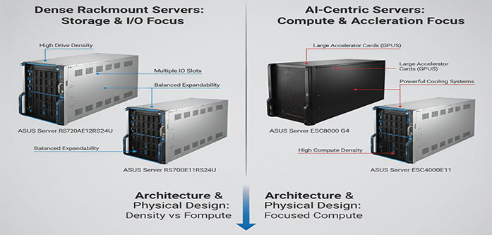 سرورهای رکمانت عموماً برای ترکیب فضای ذخیره‌سازی، پردازنده‌های چندمنظوره و چگالی I/O طراحی شده‌اند و در نمونه‌هایی مانند سرور ایسوس ASUS Server RS720AE12RS24U و سرور ایسوس ASUS Server RS700E11RS12U تأکید بر ارائه تعداد بالای درایو، اسلات‌ شبکه و قابلیت توسعه متعادل دیده می‌شود. در طرف مقابل، سرورهای متمرکز بر هوش مصنوعی مانند سرور ایسوس ASUS Server ESC8000 G4 و سرور ایسوس ASUS Server ESC4000E11 ساختاری برای جای‌دادن کارت‌های شتاب‌دهنده بزرگ و سیستم‌های خنک‌کنندگی قوی‌تر دارند. شرکت‌هایی مانند رهنمون فناوری اطلاعات این تمایز را هنگام مشاوره فروش با مشتریان سازمانی برجسته می‌کنند تا زیرساخت متناسب با نیازهای پردازش خریداری شود.