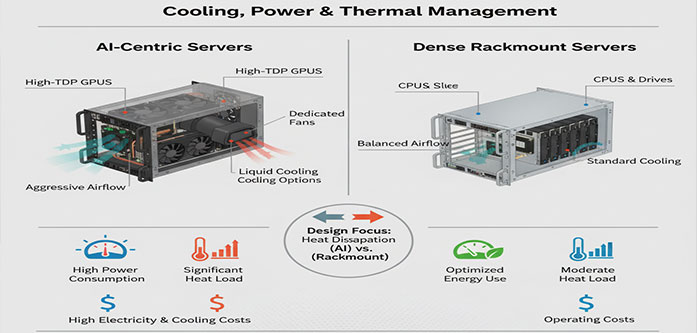 طراحی خنک‌کنندگی برای سرورهای هوش مصنوعی باید توان دفع حرارتی کارت‌های GPU را داشته باشد و به همین دلیل این دستگاه‌ها معمولاً دارای کانال هوای قوی‌تر، فن‌های اختصاصی و در برخی پیاده‌سازی‌ها گزینه‌های خنک‌کننده مایع هستند. در مقایسه، سرور رکمانت برای مدیریت دمای پردازنده‌ها و درایوها از راهکارهای متعادل‌تری استفاده می‌کند که مصرف انرژی و هزینه عملیاتی را کاهش می‌دهد. هنگام تهیه سرور، خریداران باید هزینه برق و خنک‌کننده زیرساخت را محاسبه کنند زیرا سرورهای هوش مصنوعی می‌توانند تأثیر قابل‌توجهی روی قبض برق و بار خنک‌کنندگی دیتاسنتر داشته باشند.